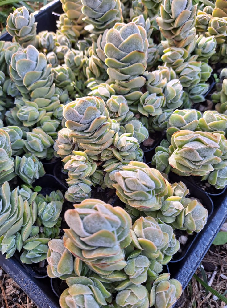 This is for one Crassula 'Ivory Pagoda' plant growing in a 2" inch container shipped bare root. All of our plants are grown in the beautiful Temecula Valley in sunny Southern California, and we ship within the United States. Shipping is done Monday thru Friday.